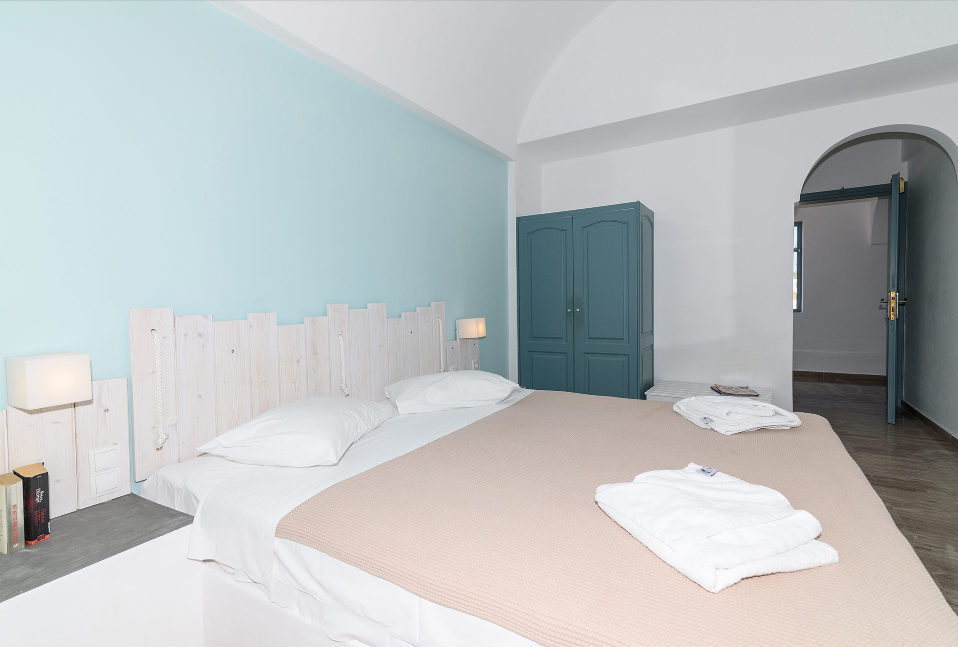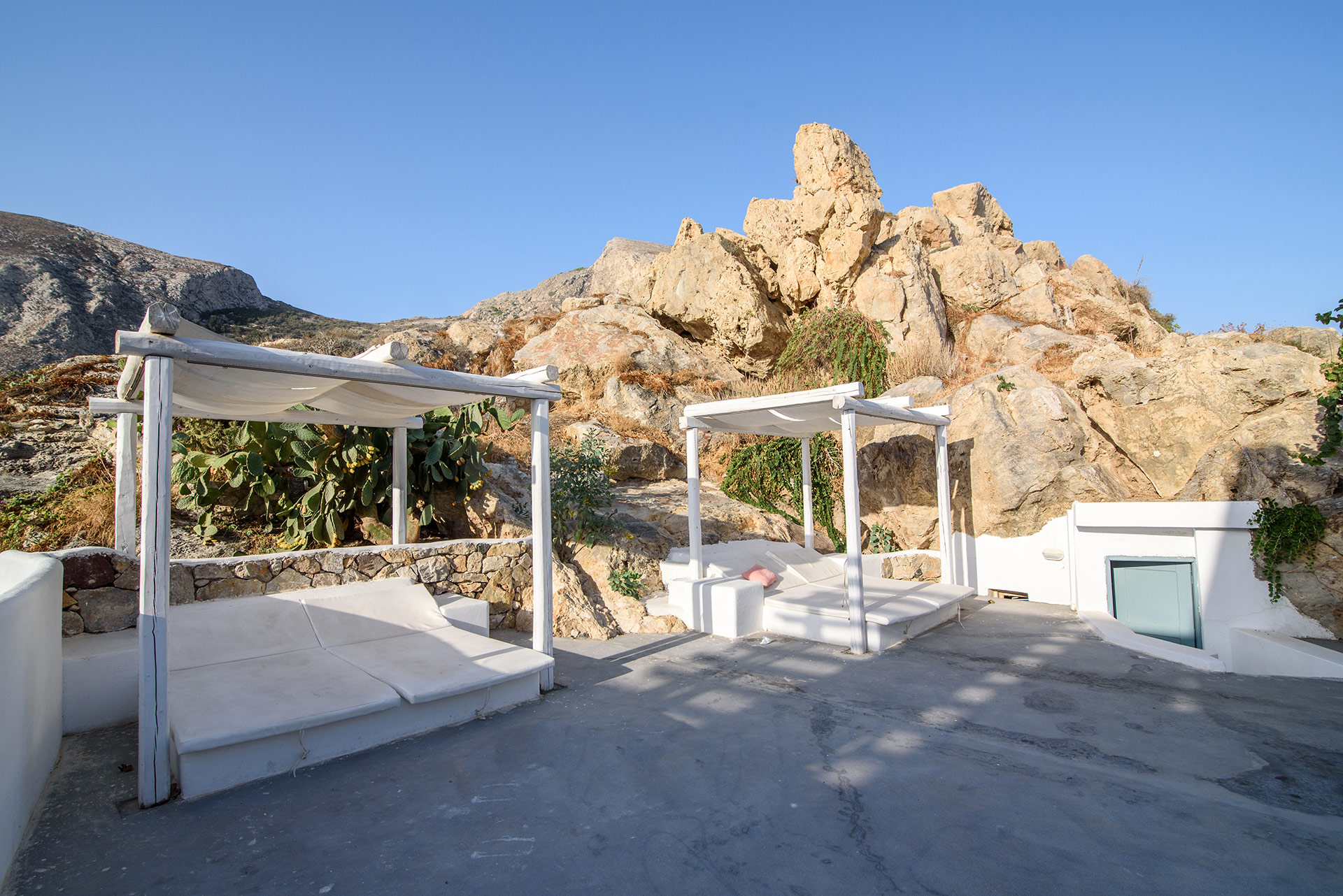 Lage: Direkt im Urlaubsort Kamari gelegen, der Sand/Kiesstrand ist in Gehweite. Restaurants/Tavernen, Bars und Einkaufsmöglichkeiten direkt in der Umgebung. Die Hauptstadt Thira ist ca. 11 km und der Flughafen ist ca. 4 km entfernt.