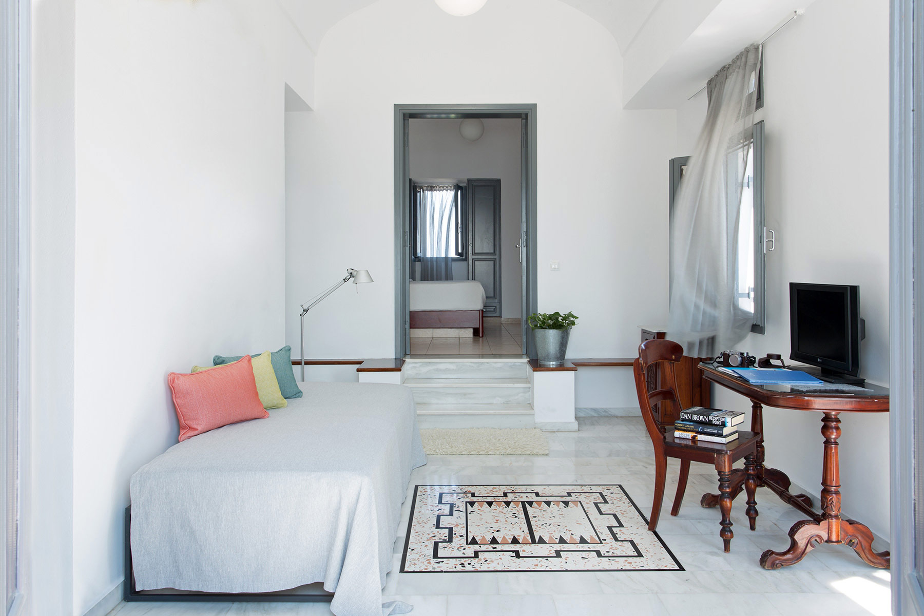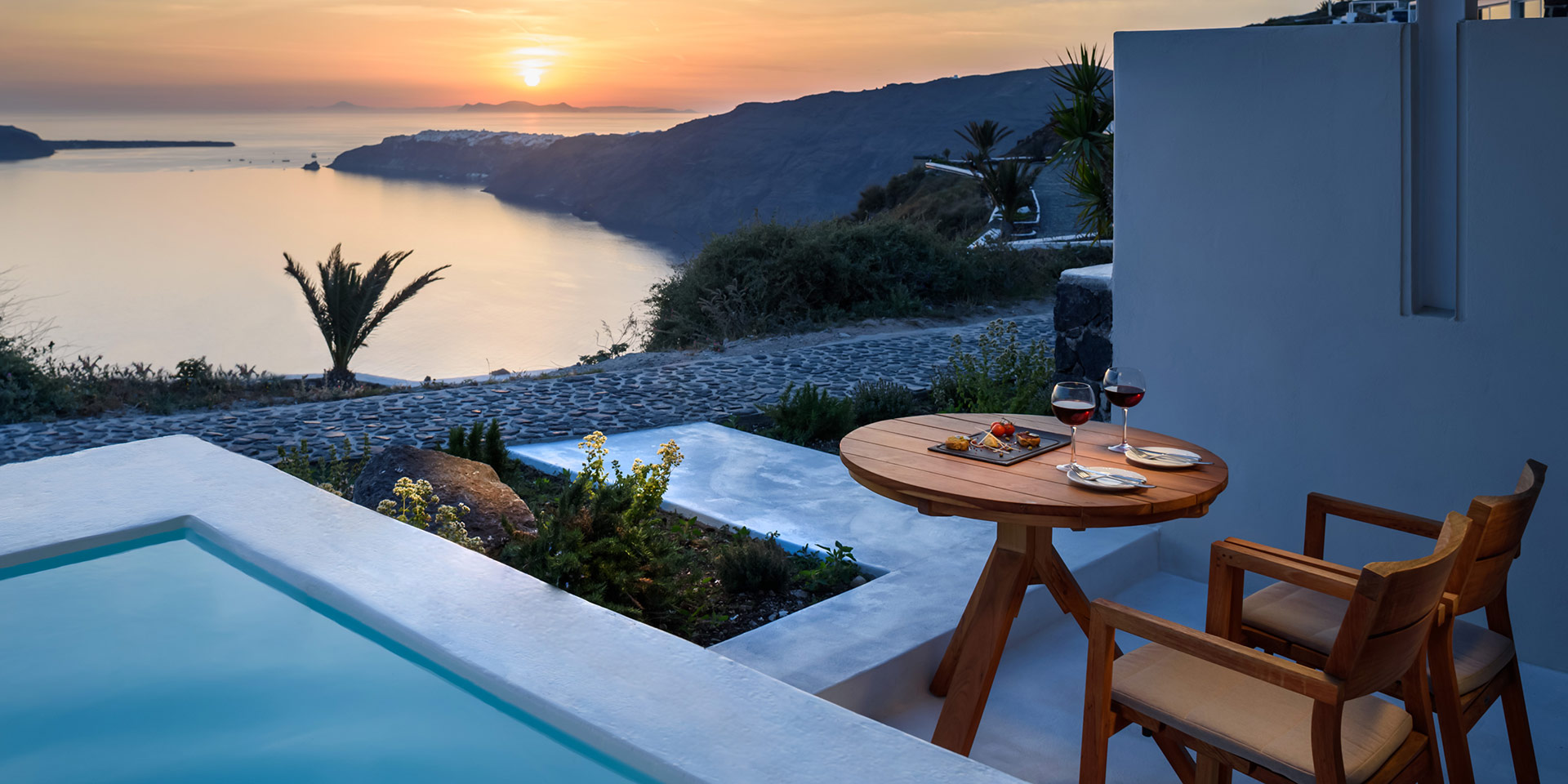 Lage: Das Hotel befindet sich in einzigartiger Lage auf den Klippen mit Blick auf das ägäische Meer. Es liegt nicht weit von der Hauptstadt Thira entfernt und ist bekannt für die herrlichen Sonnenuntergänge. Der nächste Strand ist ca. 7 km und der Flughafen ca. 8 km entfernt.