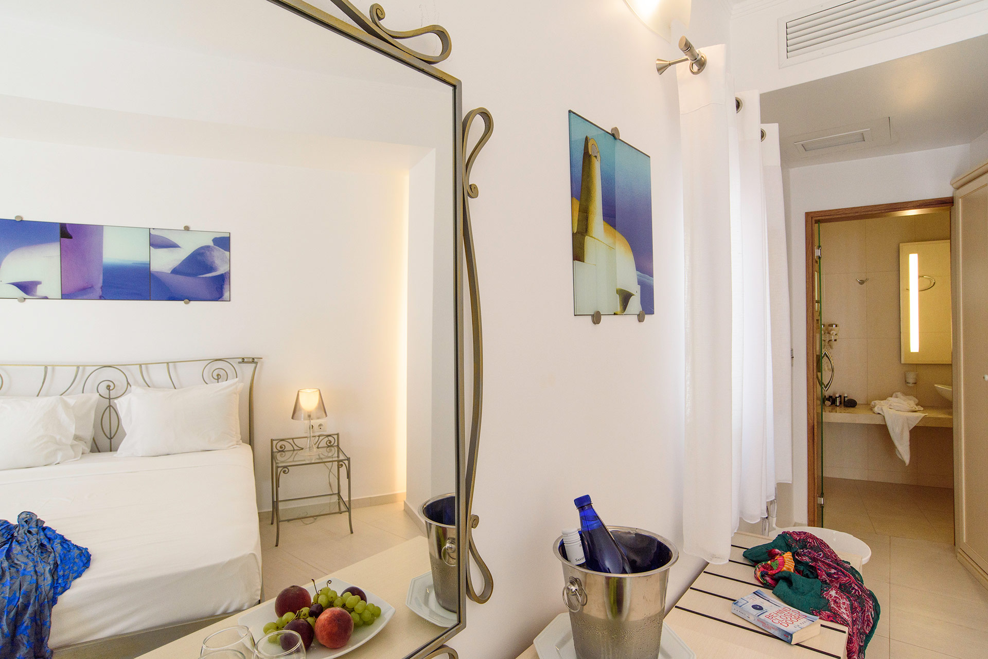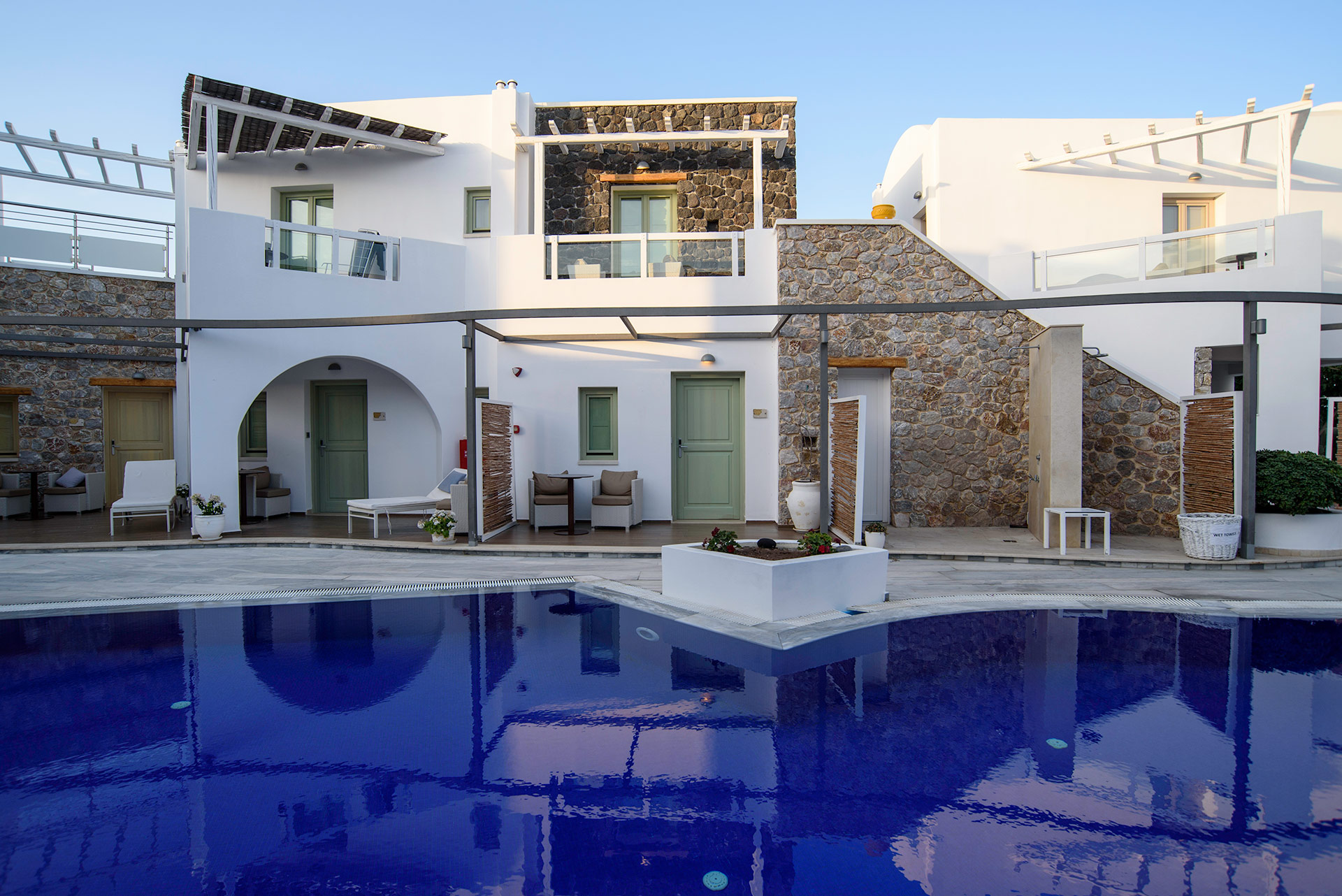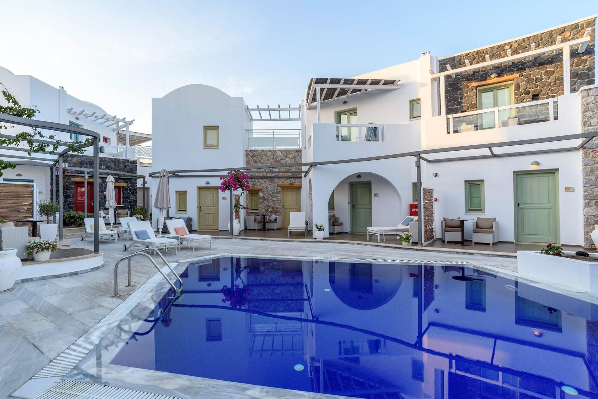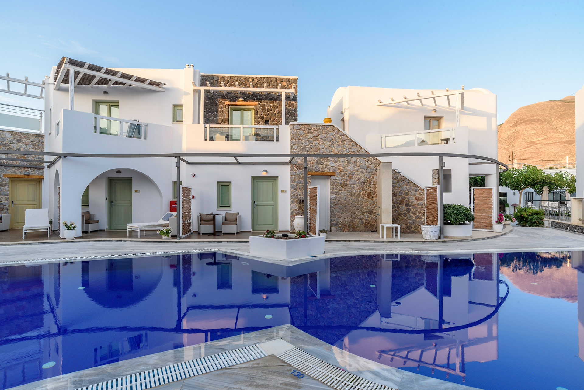 Lage: Das „Adult only“ Hotel liegt direkt im Urlaubsort Kamari, wenige Meter vom Strand entfernt. Restaurants/Tavernen, Bars und Einkaufsmöglichkeiten direkt in der Umgebung. Die Hauptstadt Thira ist ca. 11 km und der Flughafen ist ca. 4 km entfernt.