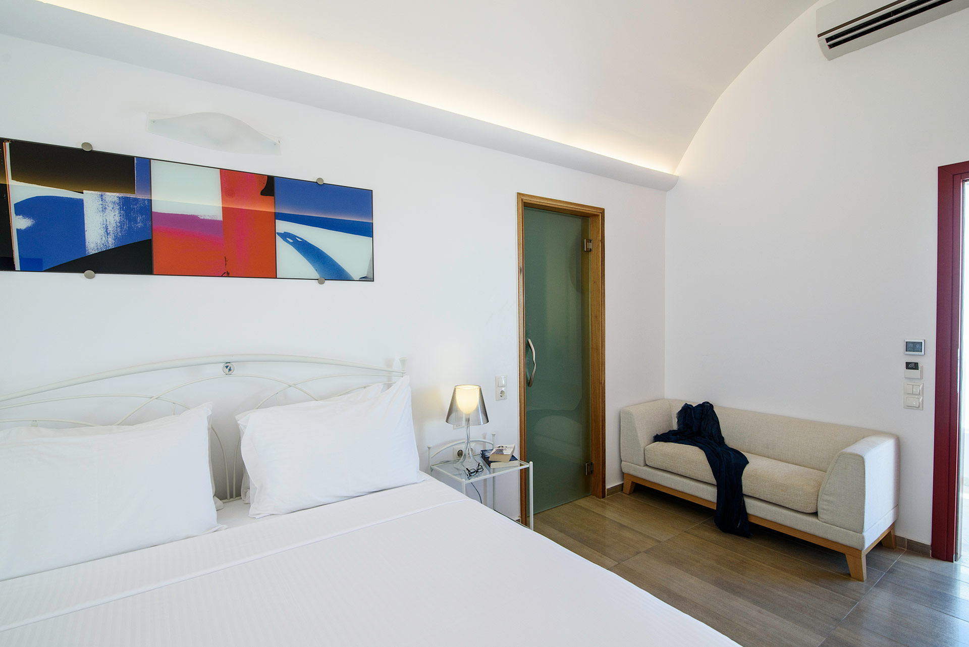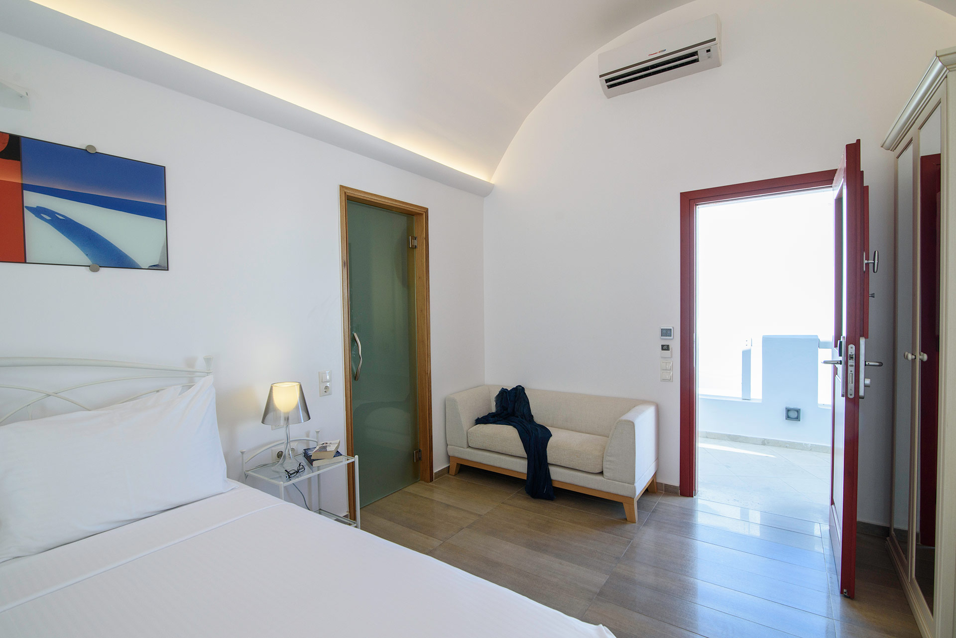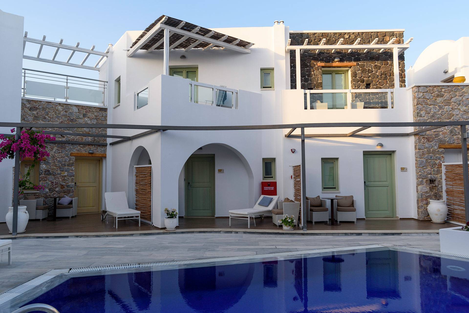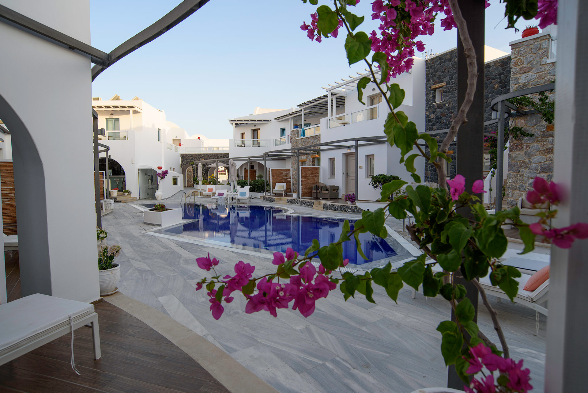Lage: Das „Adult only“ Hotel liegt direkt im Urlaubsort Kamari, wenige Meter vom Strand entfernt. Restaurants/Tavernen, Bars und Einkaufsmöglichkeiten direkt in der Umgebung. Die Hauptstadt Thira ist ca. 11 km und der Flughafen ist ca. 4 km entfernt.