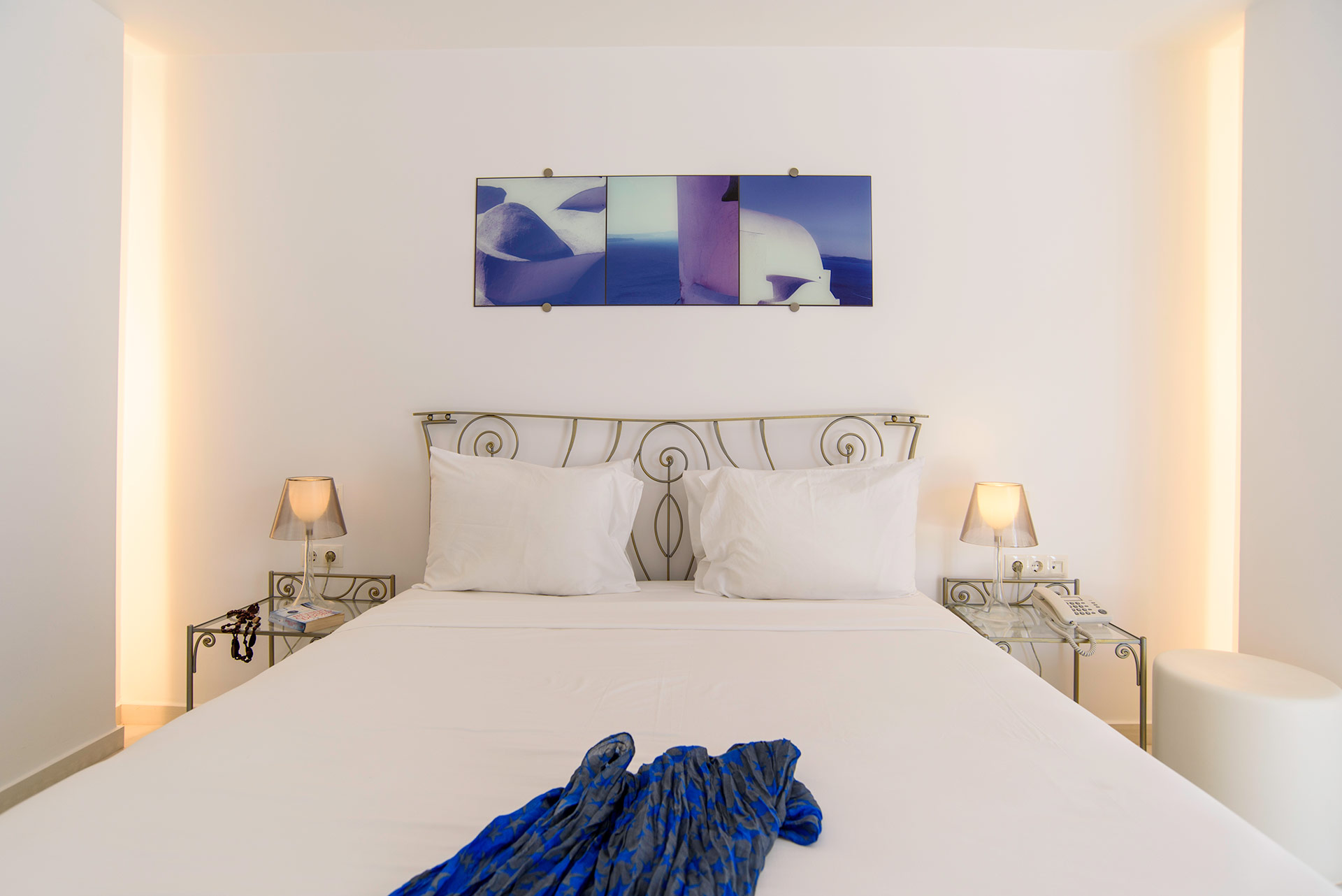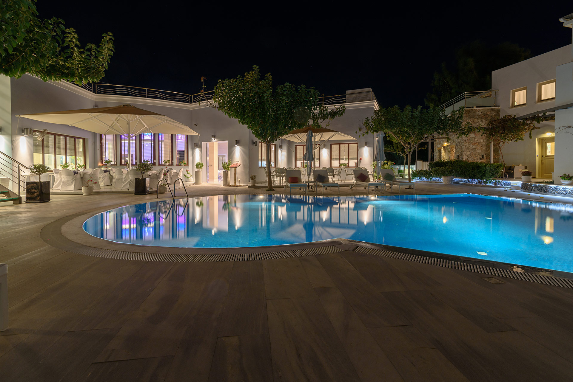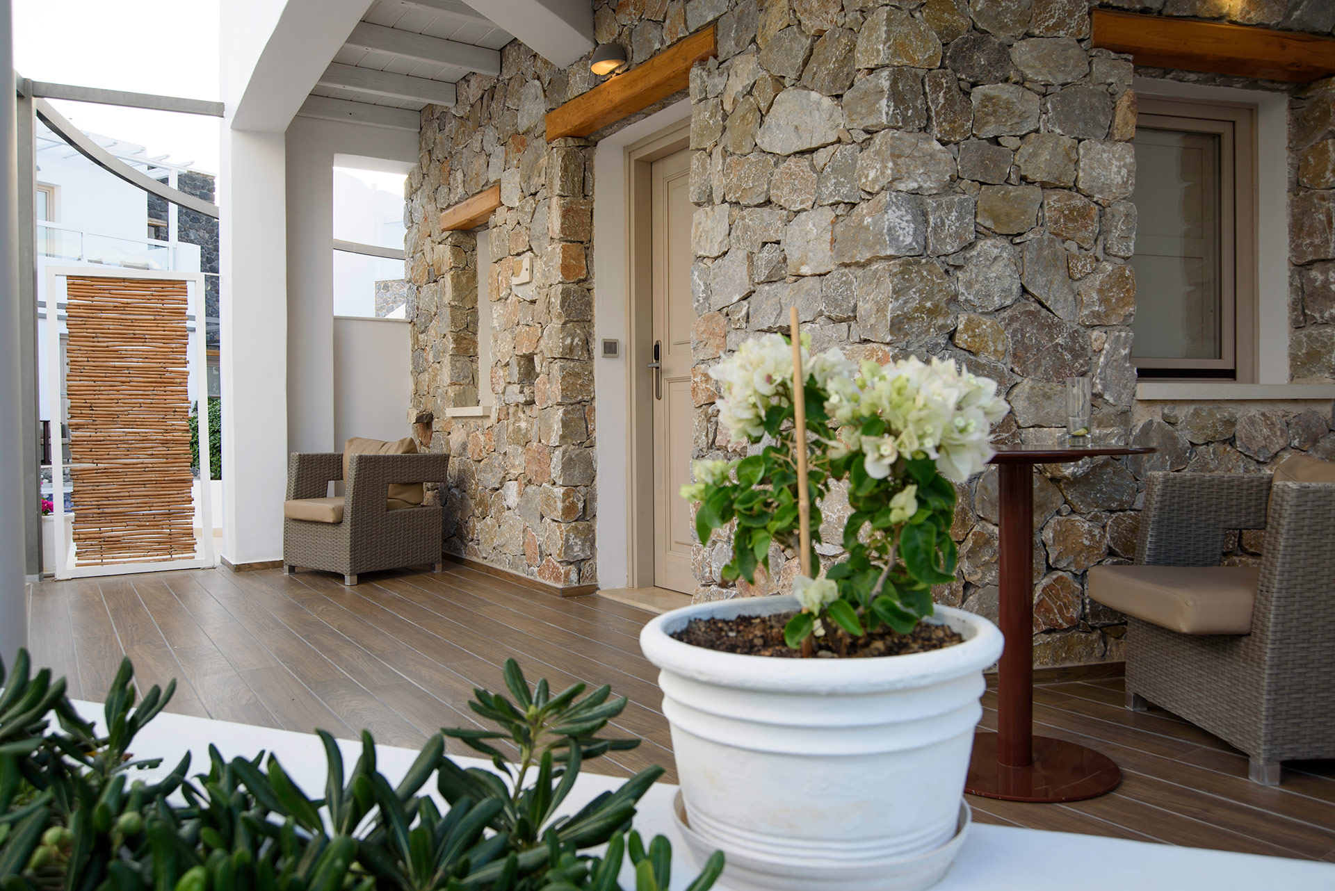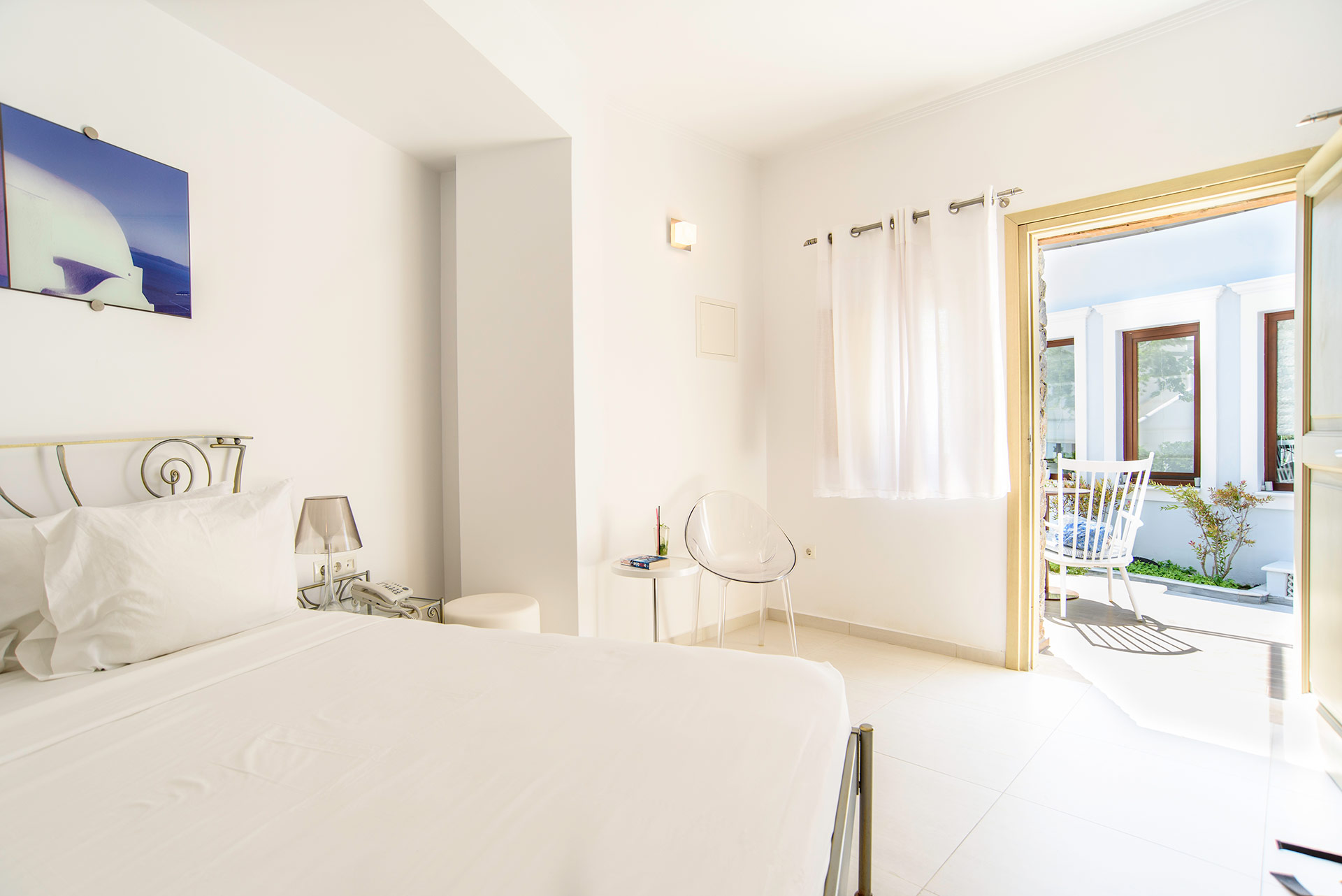 Lage: Das „Adult only“ Hotel liegt direkt im Urlaubsort Kamari, wenige Meter vom Strand entfernt. Restaurants/Tavernen, Bars und Einkaufsmöglichkeiten direkt in der Umgebung. Die Hauptstadt Thira ist ca. 11 km und der Flughafen ist ca. 4 km entfernt.